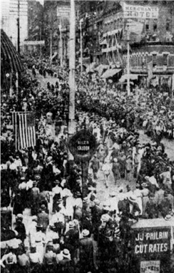 The resulting loss of possessions stopped the evening electrical parades which brought thousands of Omahans and visitors from surrounding towns to the business district on the night of the annual event. All along the route of the procession, thousands of faces filled windows and looked down from rooftops. People thronged the streets and jammed the sidewalks to overflowing.