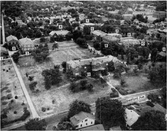 In the photo, buildings are numbered to aid in their identification. Dates in parenthesis indicate when the various units were completed and occupied.