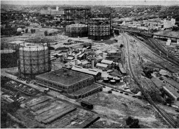 Among the plant units are a machine shop, generator and boiler plants, exhausters, pumps, purifiers, oil storage compartments, cooling tower, coke stock piles and 10 new propane gas storage holders. More than 350 employees work in this area daily.