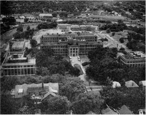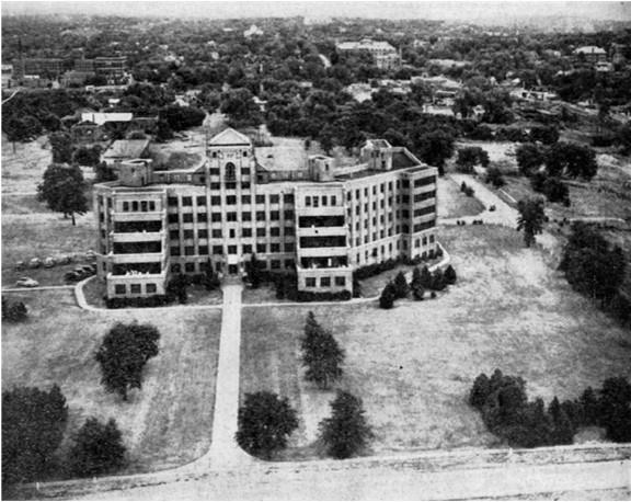 Originally located in Lincoln (1883), the State-supported College of Medicine was moved to Omaha in 1912 because of superior clinical facilities. The first building (lower right) was occupied in 1913. It is the North Laboratory. For the first four years it was the entire college. It now houses the bacteriology laboratories, the pathology and anatomy departments.