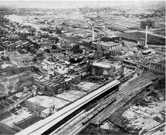 The long white roof in the foreground covers Swift and Company's loading and icing dock. In right background is the Livestock Exchange Building. Between the tall white chimney and the Exchange Building are hog market pens. West of them are the sheep pens. On the far side are cattle pens.