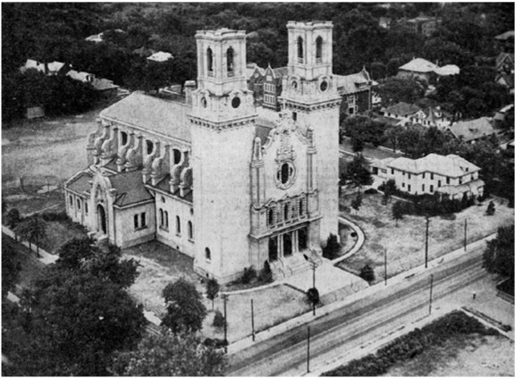 The Very Rev. Ernest G. Graham, pastor, whose parish house is shown at lower right, has major expansion plans. These include construction of a new half-million-dollar grade and high school on the recreation grounds behind the cathedral. New recreation space will be provided east of the proposed school. School plans are being prepared by Leo A Daly Co.