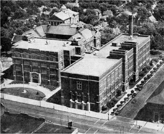 The old section of South High, built in 1904, is furthest west away from the camera at the upper left. The newer and larger portion of the building (left center and along K Street) was completed in 1926.