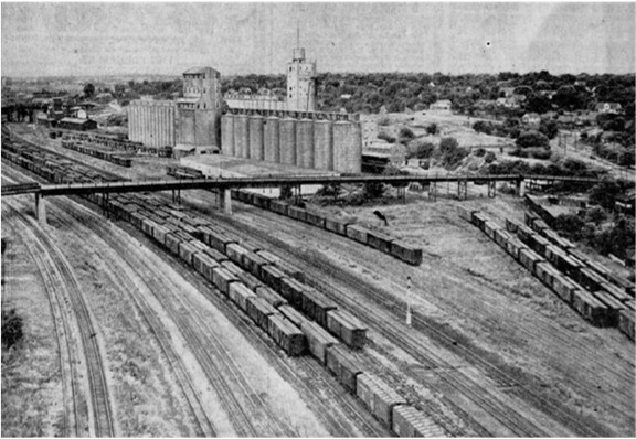 From the Magic Carpet you are looking south. The large structure in the foreground is the 1,750,000-bushel elevator of the Westcentral Co-operative Grain Company. Seemingly rising out of the elevator at the rear are the buildings of the Maney Milling Company. South of the elevator is the plant of the Famous Molasses Feed Company.