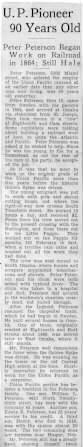 Peter Peterson, 3202 Miami street, who entered the employ of the Union Pacific railroad at an earlier date than any other man now living, was 90 years old yesterday. Peter Peterson, then 19, came from Sweden with his parents in 1864, and arrived at Omaha via steamboat from St. Joseph. They took rooms in a "row" at Eighteenth and Cass streets. Some capitalists were talking about building a railroad west of here, to unite the Atlantic and Pacific. Peter Peterson was asked if he wished to help. Since he was too young to file for a homestead, as did the rest of the men in his party, he accepted the job. So it was that he went to work on the original grade of the Union Pacific more than five years before the historic Golden Spike was driven. The young emigrant was put to work with pick and shovel cutting brush, out where the right-of-way now crosses South Twentieth street. He worked 10 hours a day, and received $2. From there his crew moved out to the present crossing with the Burlington, and from there out to the Little Pappio. They worked out on the Pappio for months, till February in fact, when a terrible rain came and washed out all the work they had done. The crew was next moved to South Omaha, where horses and scrapers supplanted wheelbarrows and shovels. Peter Peterson and his chum were both seized with typhoid fever. The chum was taken to a hospital and died; Peterson laid around in the workmen's shanties, nearly dead, but pulled through. After the typhoid, Peterson resumed the carpenter trade, which he had begun in Sweden. He built several houses in Omaha. One of them, originally erected at Eighteenth and Burt streets about 1869, was moved later to East Omaha, where it still stands. Mr. Peterson well remembers the furor when the Golden Spike was driven. He was working on the tower on the old Central High school at the time. Shortly thereafter, he returned to work on the Union Pacific as a carpenter. Union Pacific service has become a tradition in the Peterson family. One son, William L. Peterson, 4611 North Twenty-ninth street, has been with the company 45 years. Another son, Edwin R. Peterson, has 25 years service to his credit. A third son, Henry, who died in 1919, was with the system almost 30 years. The two remaining sons are farmers near Hooper, Neb. Mr. Peterson still has a steady hand, shaving himself twice weekly.